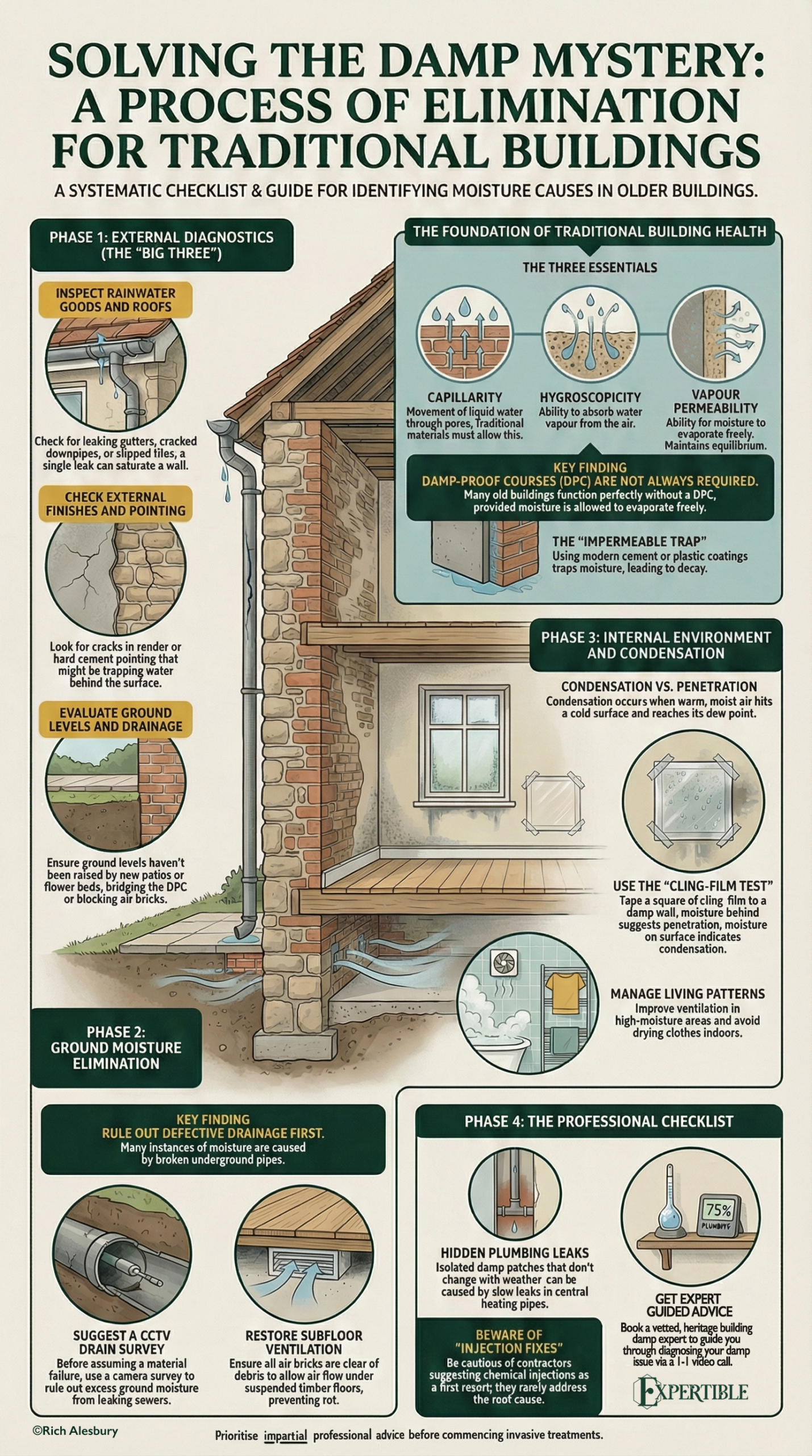 Proper diagnosis involves understanding how the building was constructed, identifying where moisture is entering, and observing how damp behaves over time.